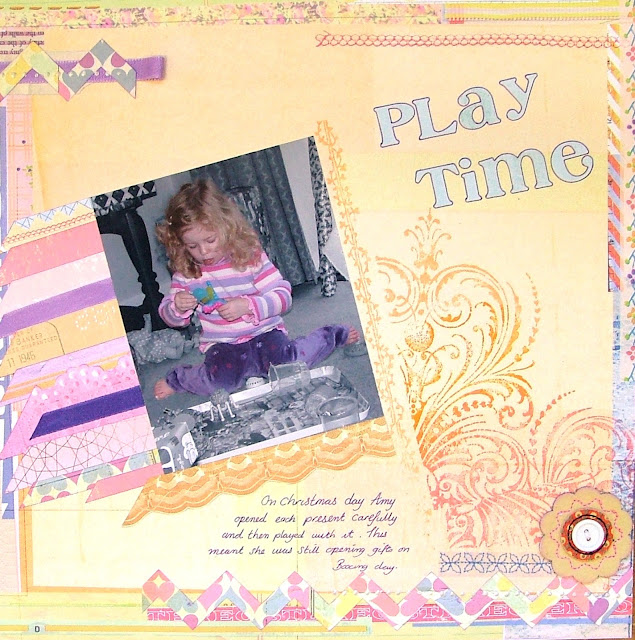 For my first page I was really pleased to find these photos with the colours that matched the papers so well. The flourishes above and below the photos in purple are stamped and the white detail is added with a pen.